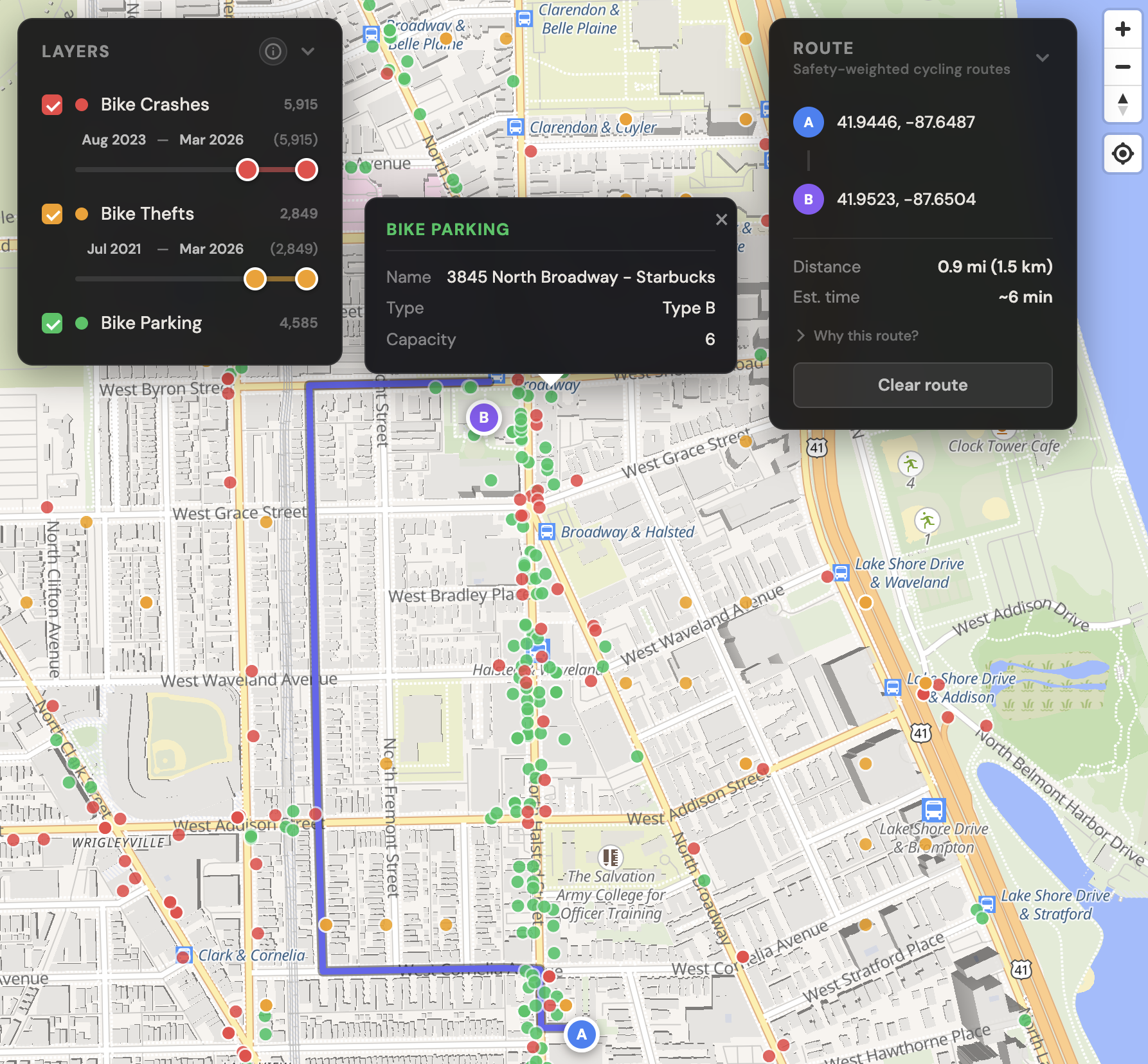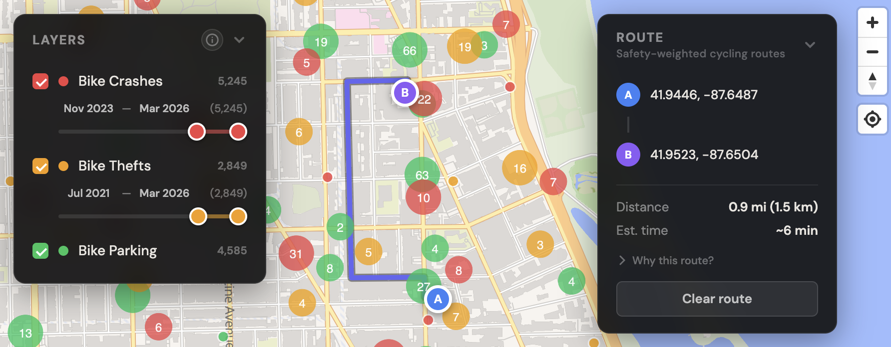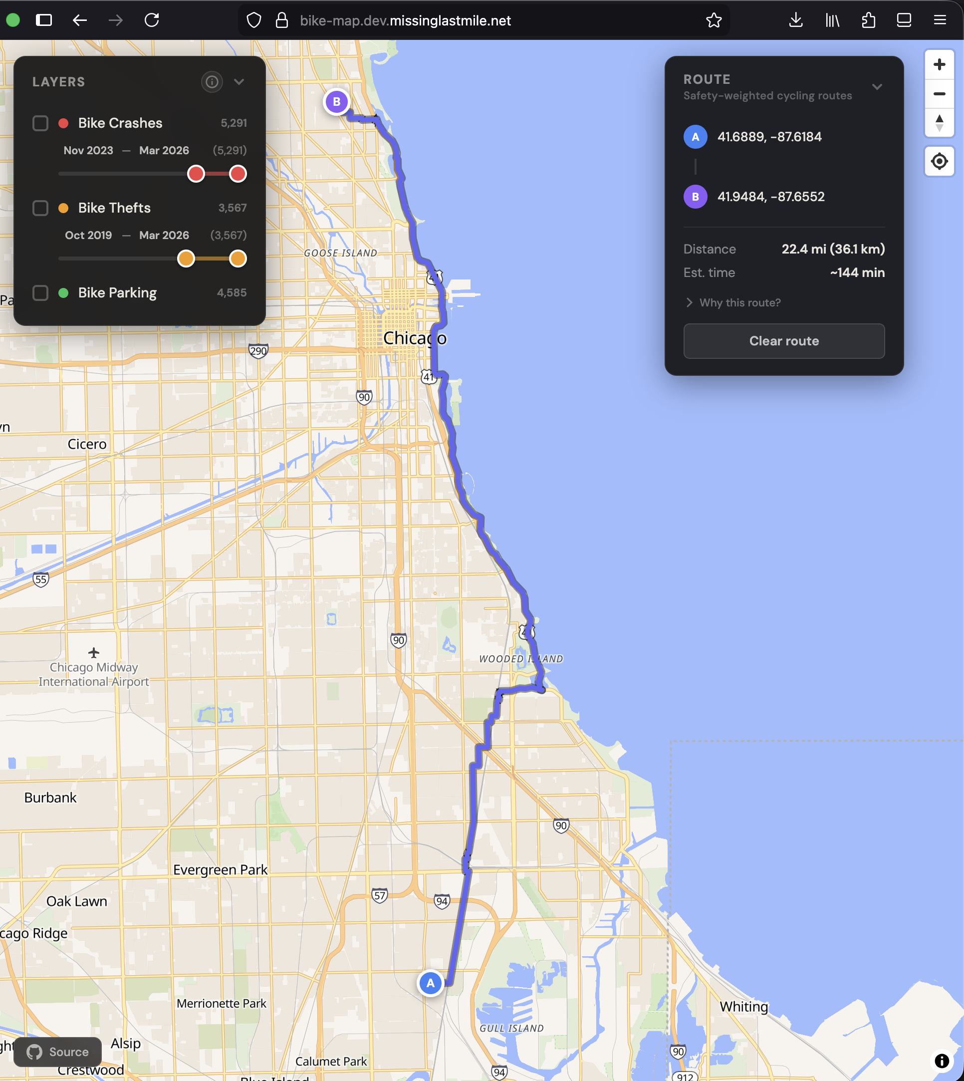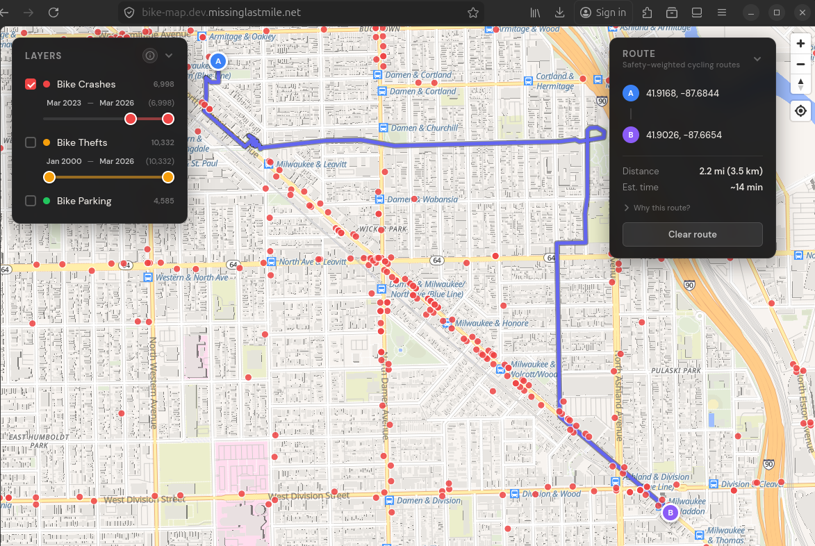 The app is live at bike-map.dev.missinglastmile.net. Pick two points in Chicago and see what route it suggests. Toggle the crash and theft layers to see how risk is distributed across the city.