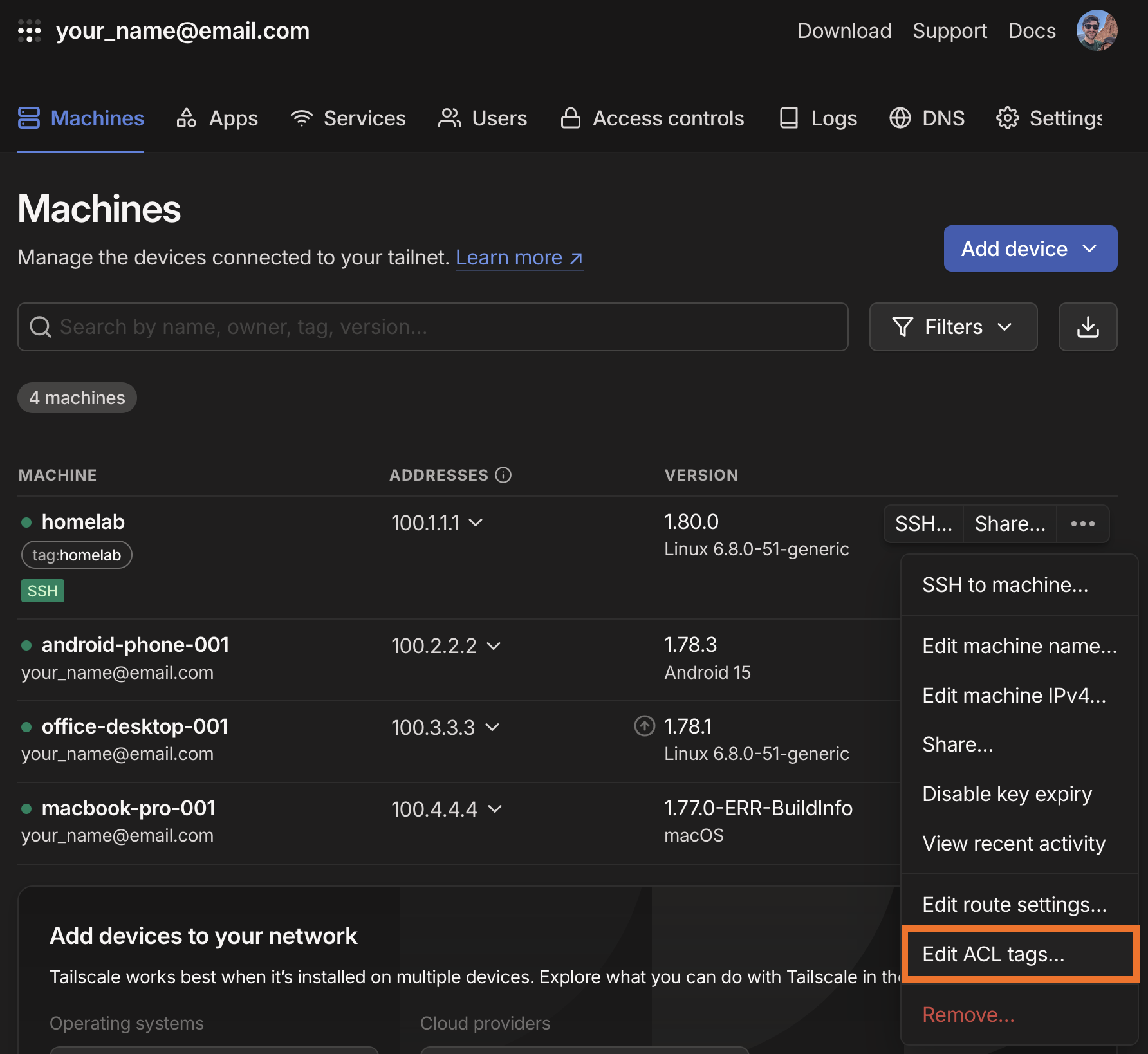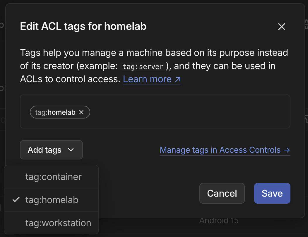 In the Edit ACL Tags interface, click the Add tags dropdown and select the tag:homelab option. Note that these options were defined in the tagOwner section of ACL policy file.