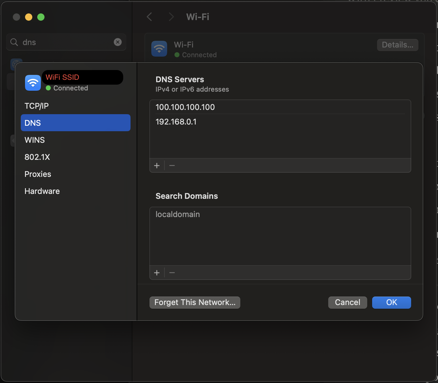 You might have to manually add your tailnet’s DNS server IP address to your MacOS-running-machine’s DNS servers. Go into system settings, search for DNS, and add IP address “100.100.100.100” ahead of the existing IP address (Most routers use “192.168.0.1”). If you sometimes connect to Wi-Fi and other times use ethernet, you’ll probably have to do this for both connection modes.